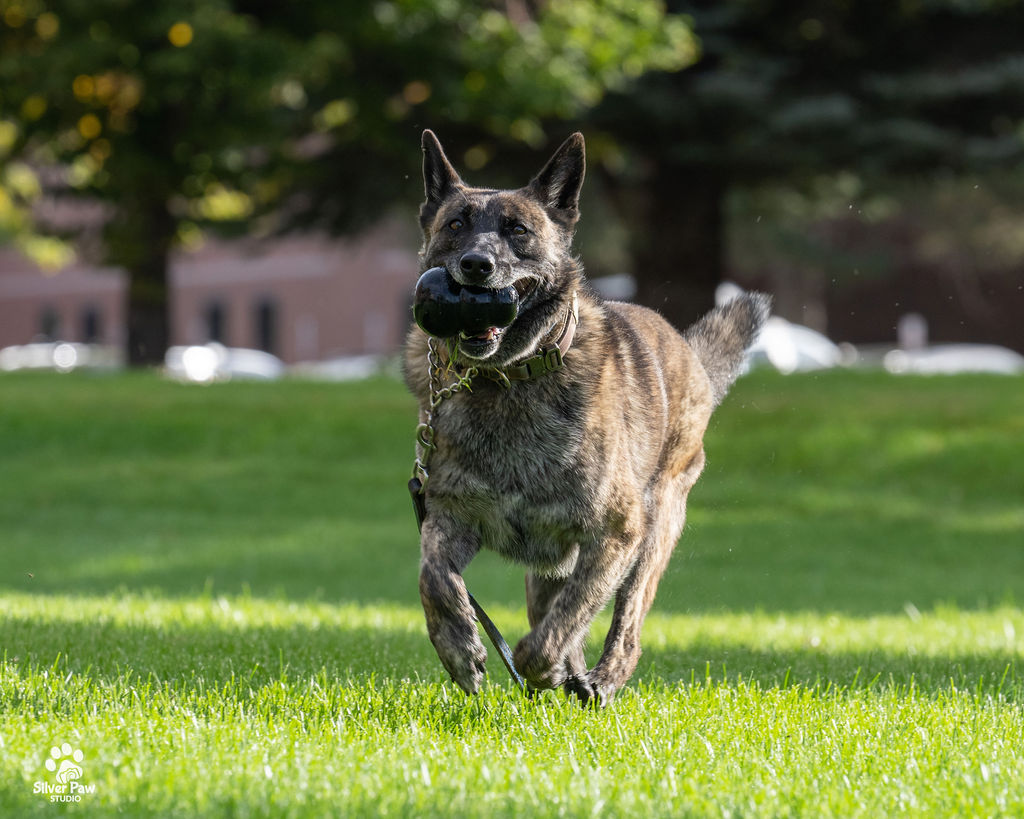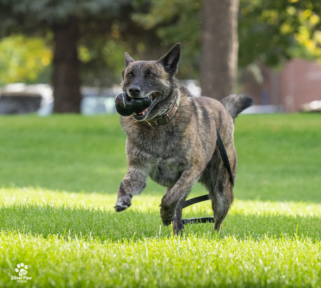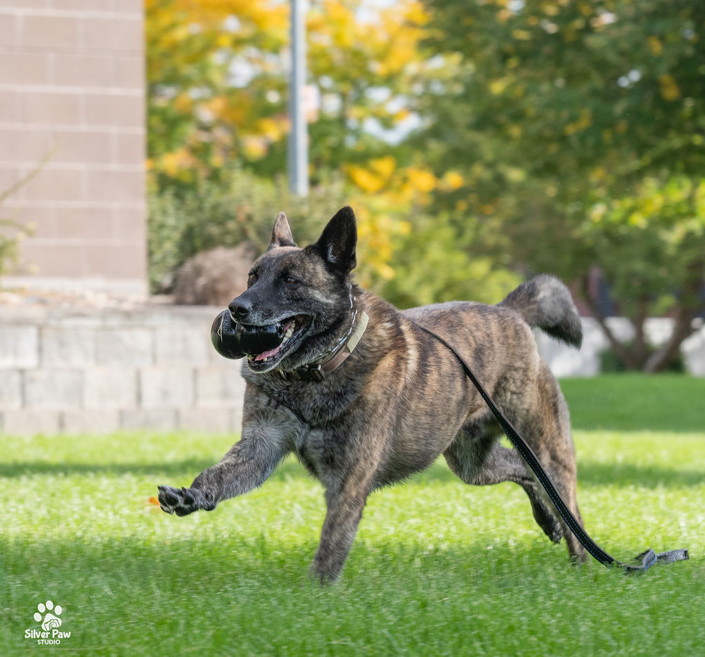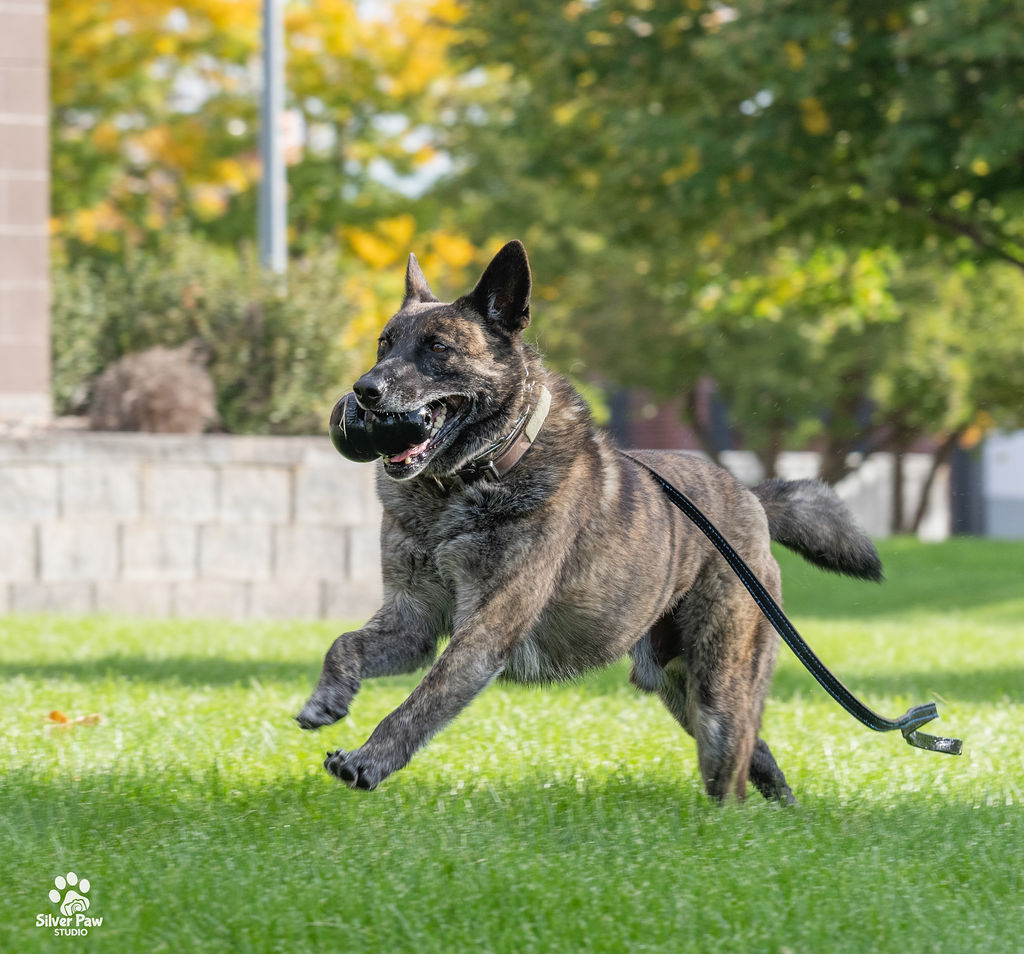 Dox loves his Kongs, running around the fields and playing with the other dogs. Whenever Deputy Feyen is home, Dox follows him around and wants to help with whatever he is doing. His favorite playmate is the family’s French Bulldog.