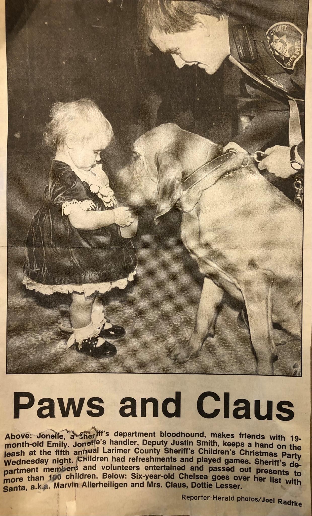 Does this young deputy look familiar? This is Sheriff Justin Smith with his K9 partner back in 1994. K9 Janelle was a female bloodhound trained in tracking and served until 2000. K9 Jonelle was named in honor of Jonelle Matthews, a 12 year old girl who disappeared in Greeley in 1984. Sadly, this young girl was never found. During K9 Jonelle’s career, she successfully tracked suspects and missing persons up to a mile away from their last seen point. According to Sheriff Smith, “Jonelle was a tremendous partner. She served the citizens of Larimer County well and honored her namesake, Jonelle Matthews, through her dedication.”